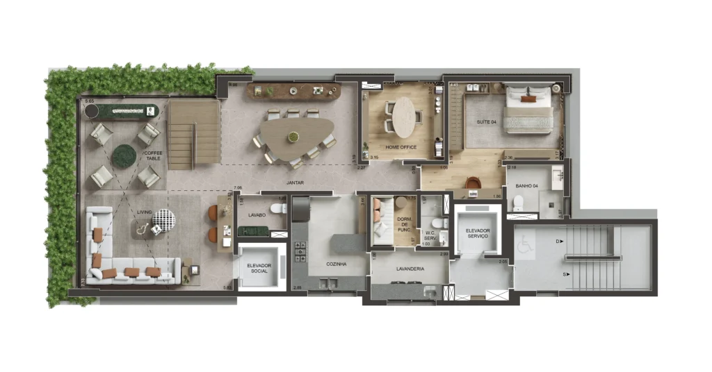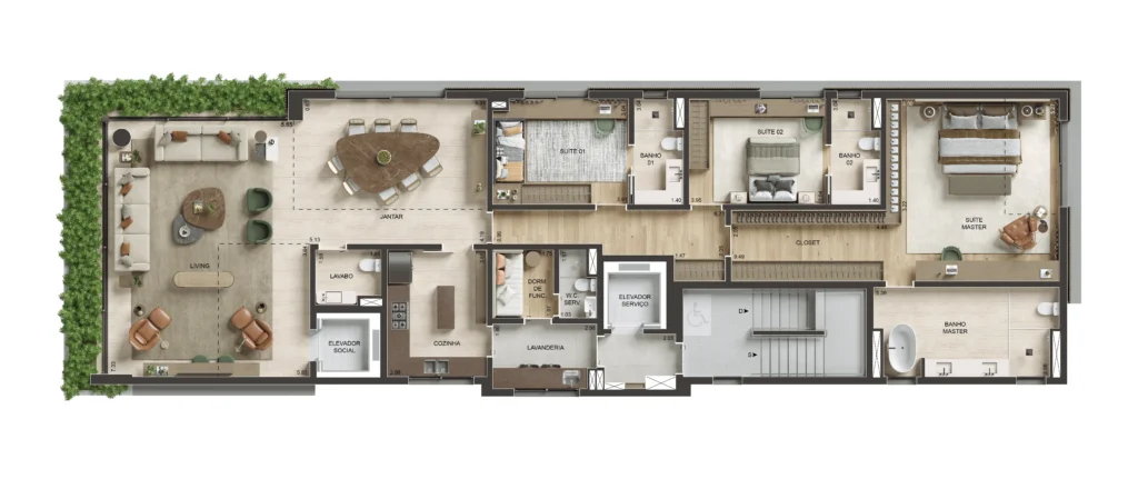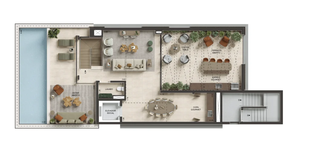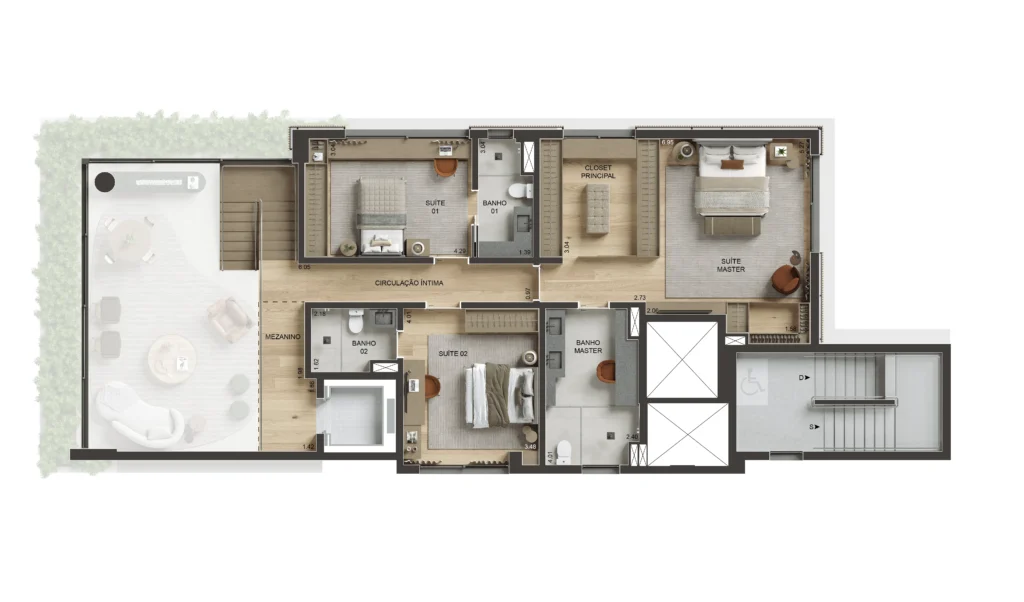 • Perspectiva ilustrativa da planta inferior da unidade Duplex de 268,17 a 268,65 m².